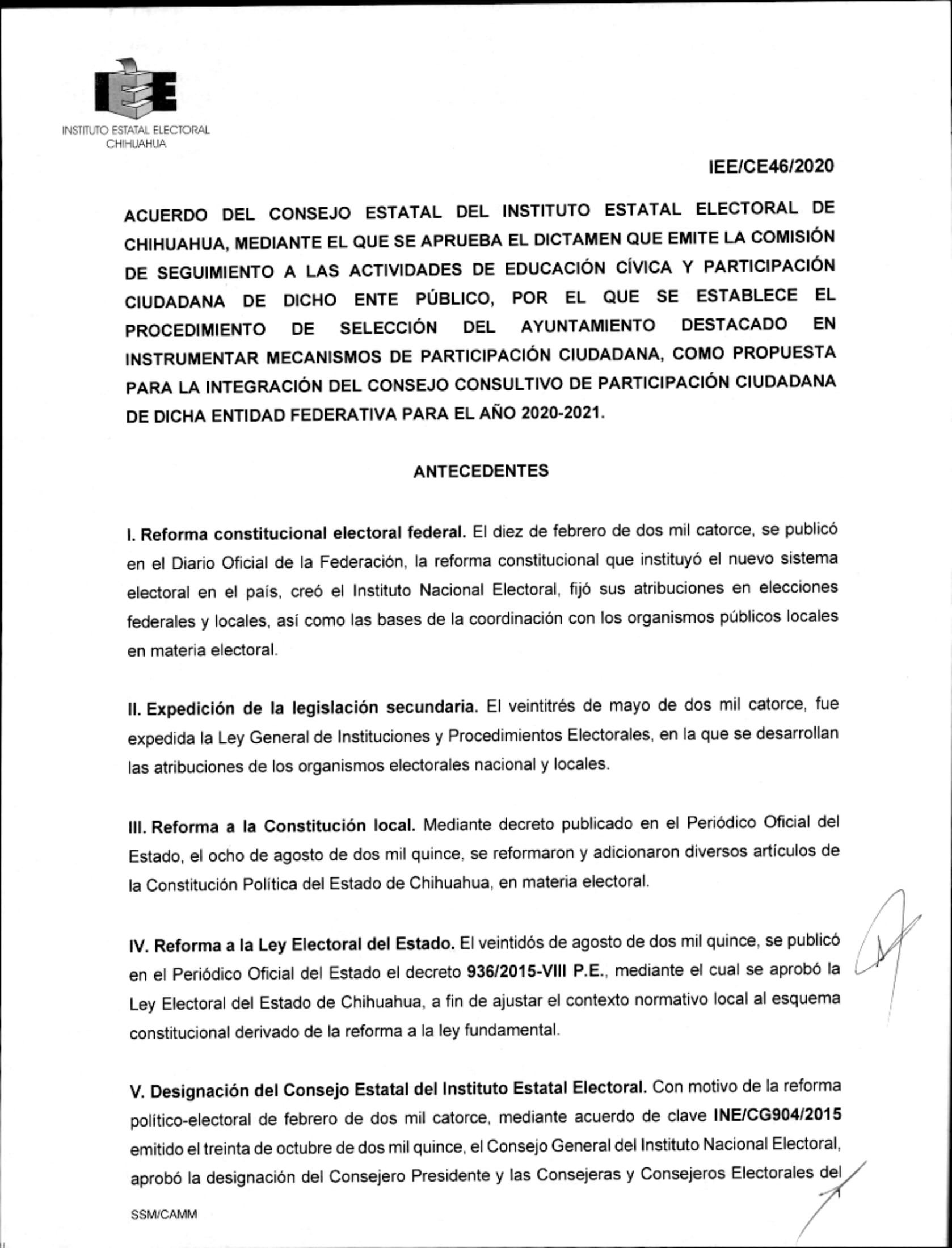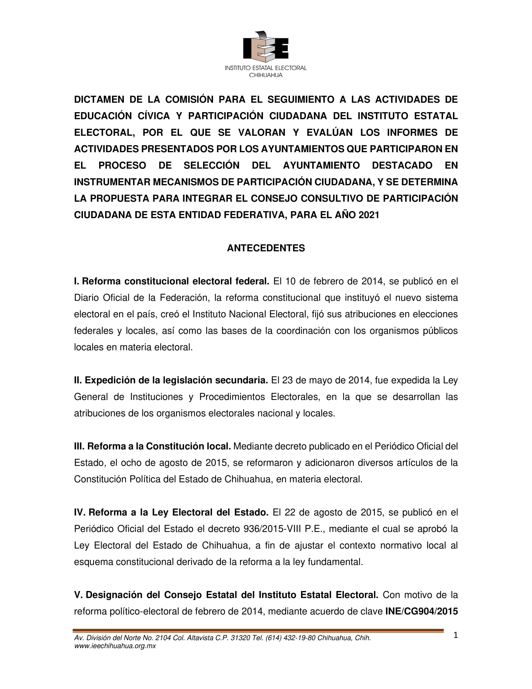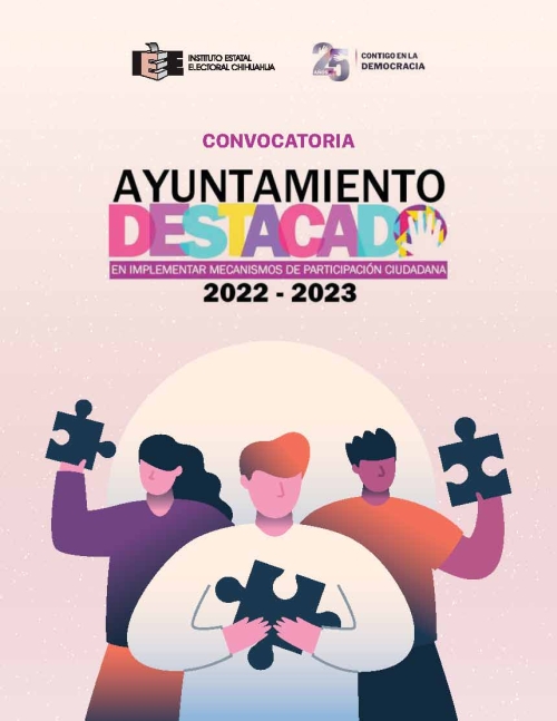 El Instituto Estatal Electoral de Chihuahua (IEE) invita a los Ayuntamientos que deseen participar en la Convocatoria de Ayuntamiento Destacado 2024, con el propósito de seleccionar al Ayuntamiento que se haya destacado en instrumentar mecanismos de participación ciudadana y que tenga interés en integrarse al Consejo Consultivo de Participación Ciudadana que establece la Ley de Participación Ciudadana del Estado de Chihuahua con fundamento en lo dispuesto en el artículo 9 de la Ley de Participación Ciudadana del Estado de Chihuahua y 18 del Reglamento de la citada Ley. El Ayuntamiento Destacado será elegido de entre los ayuntamientos que participen en el procedimiento de selección, conforme a la convocatoria que para tal efecto emite el IEE y que se reproduce arriba en este sitio, bajo los siguientes elementos de evaluación: