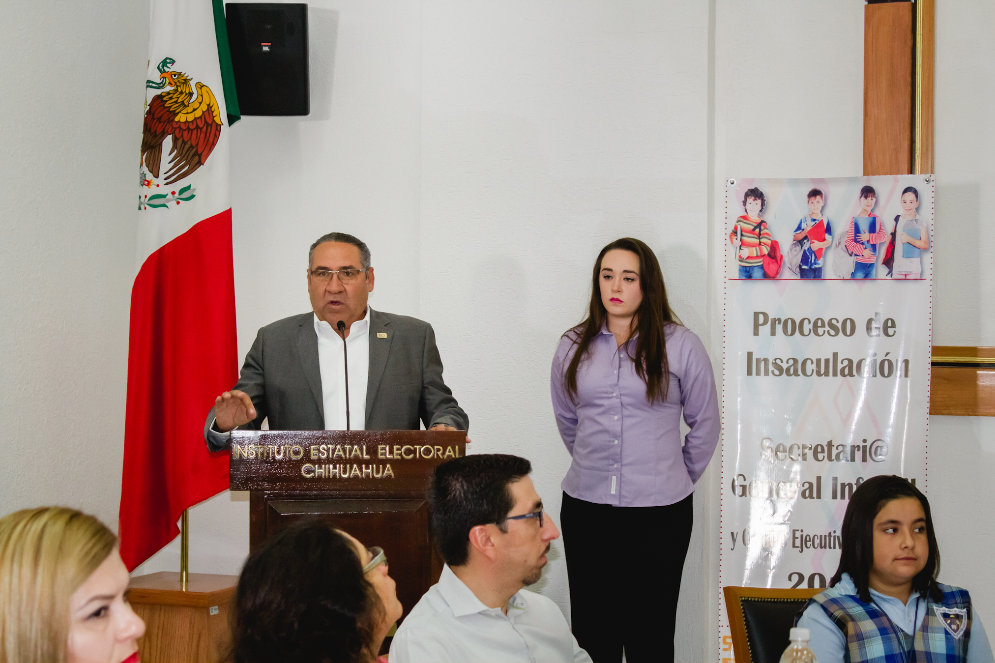 La niña Diana Victoria Paredes Figueroa, en representación de los niños y niñas de las escuelas públicas del estado de Chihuahua, agradeció al Instituto Estatal Electoral por enseñarles los valores de la democracia a través del proceso de insaculación: “Hoy todos seremos testigos de que la transparencia está presente en cada una de las acciones de nuestros maestros”, expresó.