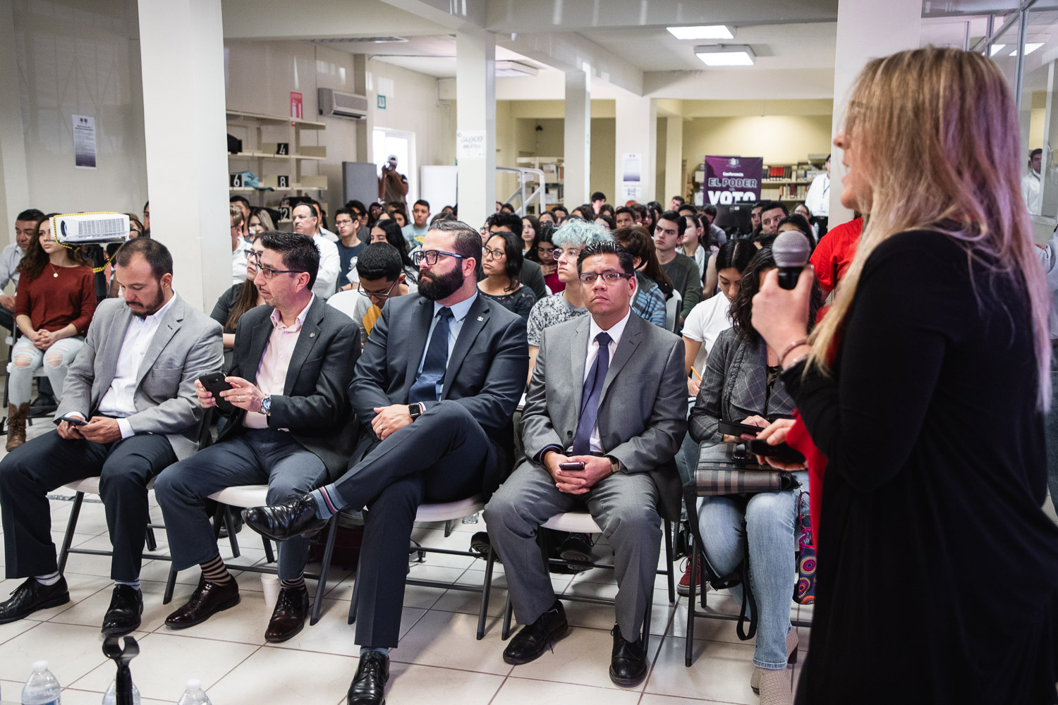 La conferencia contó con la presencia de alumnas y alumnos de instituciones educativas de nivel superior como la Universidad del Valle de México, campus Chihuahua; la Universidad Politécnica; Universidad Tec Milenio, campus Chihuahua, el Instituto Tecnológico de Estudios Superiores de Monterrey, campus Chihuahua; así como las facultades de la UACH como la de Filosofía y Letras, Derecho, Ciencias Políticas y Sociales, Bellas Artes y Contaduría y Administración. Además del recinto de la biblioteca, la conferencia se transmitió simultáneamente en otros dos auditorios de la facultad.