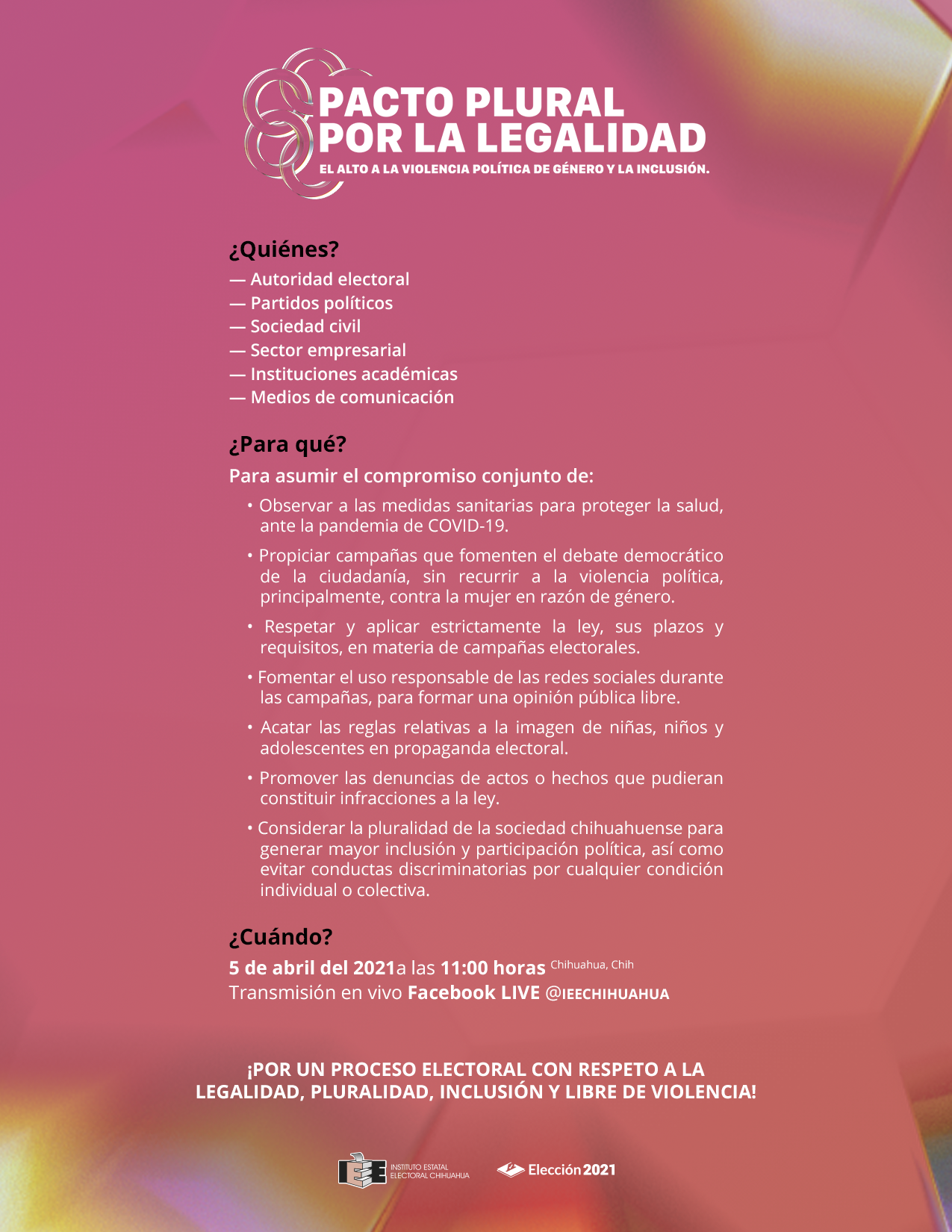 La celebración de este compromiso se realizará el lunes 5 de abril, a las 11:00 horas, en un evento virtual que se transmitirá en vivo en la página de facebook del IEE: https://fb.me/e/1DEfS3Wfv