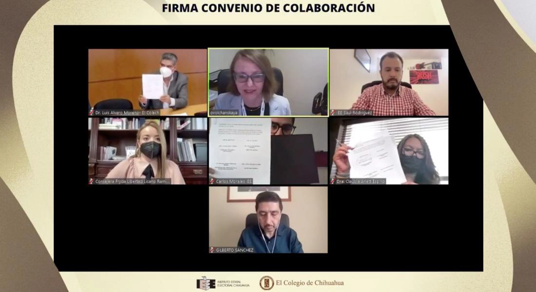 Por parte del IEE signaron la consejera presidenta Claudia Espino y el encargado del despacho de la Secretaría Ejecutiva, Carlos Morales Medina, mientras que por parte del Colegio de Chihuahua, su director general Luis Álvaro Moreno Espinoza y Lucila Delgado Alonso, secretaria general de la institución.