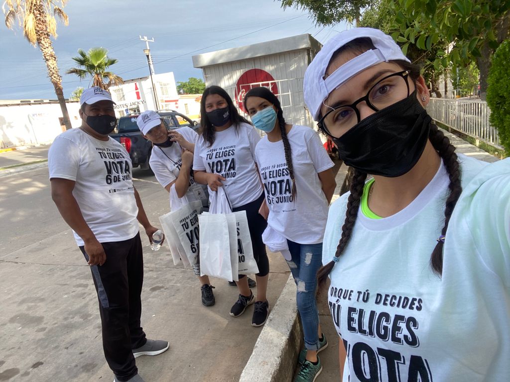 Entre el material repartido están las bolsas ecológicas para el mandado, playeras y cachuchas, así como volantes y calcomanías con la fecha clave y el llamado cívico a votar de manera libre e informada.