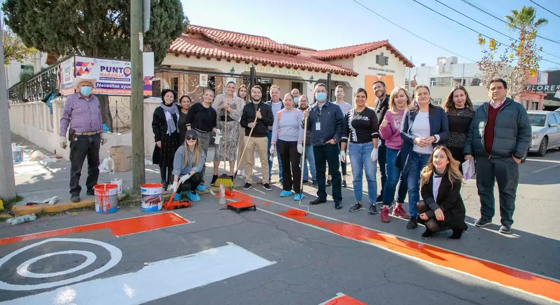 Chihuahua, Chih.— Con el objetivo de recordar a la ciudadanía que el Instituto Estatal Electoral de Chihuahua (IEE) es un punto naranja, donde las mujeres y niñas pueden solicitar ayuda en caso de sentirse inseguras al caminar por ese sector, personal del IEE participó en un cebratón, que consistió en pintar de morado, naranja y blanco el cruce peatonal de la avenida División del Norte y calle 23, justo frente a la institución.