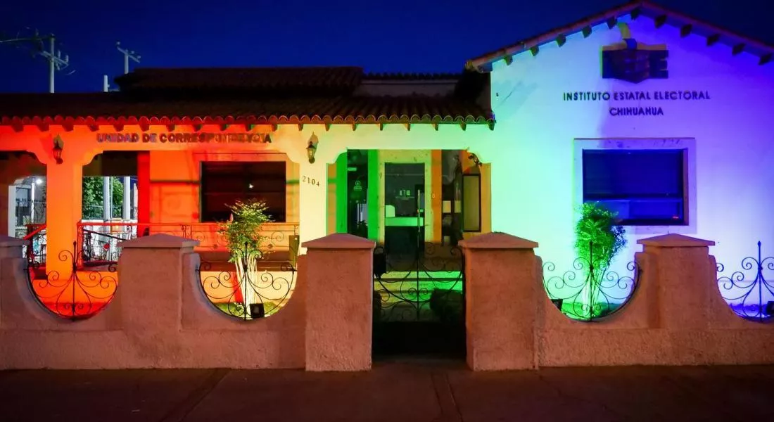 Chihuahua, Chih.- En conmemoración del mes del orgullo LGBTTTIQ+, la fachada del Instituto Estatal de Chihuahua (IEE) se iluminó con luces de colores, representando al arcoíris que es asociado con la población de la diversidad sexual.
